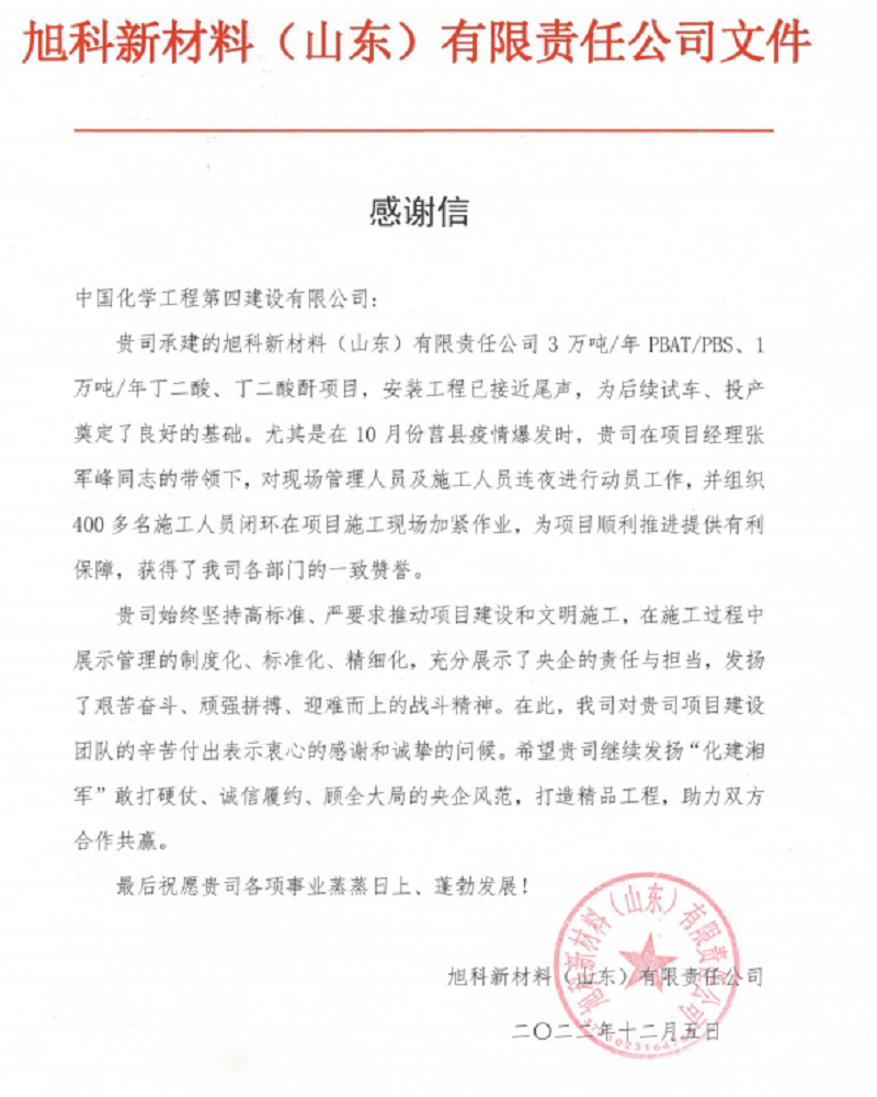 近日,公司收到旭科新材料(山東)有限責任公司發(fā)來感謝信,信中對華北公司克服疫情影響、施工條件困難、工期緊張等不利因素,如期完成旭科項目開車節(jié)點所付出的辛勤努力表示感謝。