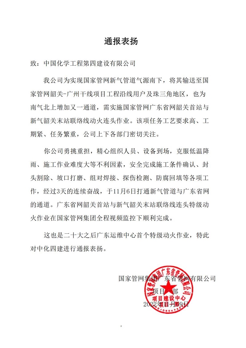 信中指出,東北公司承建的國家管網(wǎng)韶關(guān)-廣州干線項目在面對工程工藝要求高、工期緊、任務(wù)重、施工現(xiàn)場作業(yè)難度大等多重困難的情況下,項目團隊精心策劃、科學組織、統(tǒng)籌安排,克服各種不利因素,圓滿完成了廣東省網(wǎng)韶關(guān)首站與新氣韶關(guān)末站聯(lián)絡(luò)線連頭特級動火作業(yè)。此次新氣管道與廣東省網(wǎng)通道的打通,是國家管網(wǎng)新氣管道氣源南下的一個重要節(jié)點,也是黨的二十大勝利召開之后,在國家管網(wǎng)集團的全程視頻監(jiān)控下,廣東省運維中心完成的首個特級動火作業(yè),特向公司項目團隊的辛勤付出進行通報表揚。