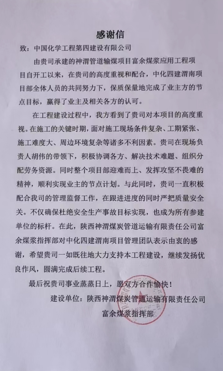 1月5日,中化勞務公司收到陜西神渭煤炭管道運輸有限責任公司富余煤漿指揮部發(fā)來的感謝信,對中化勞務承建的神渭管道輸煤項目富余煤漿應用工程項目保質(zhì)保量完成節(jié)點目標,贏得業(yè)主及相關各方的認可,表示感謝。