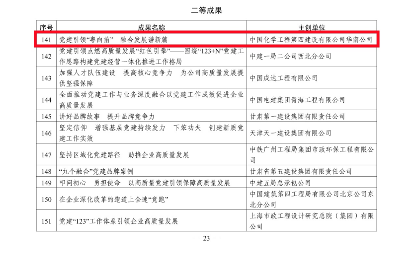 5月27日,從中國施工企業(yè)管理協(xié)會傳來喜訊,公司選送的黨建案例《黨建引領(lǐng)價值創(chuàng)造 繪就“雙百億”發(fā)展新畫卷》獲評2024年工程建設企業(yè)黨建工作一等成果,市政工程公司選送的黨建案例《黨建領(lǐng)航品牌紅 市政先鋒譜華章》和華南公司選送的黨建案例《黨建引領(lǐng)“粵向前” 融合發(fā)展譜新篇》獲評二等成果。