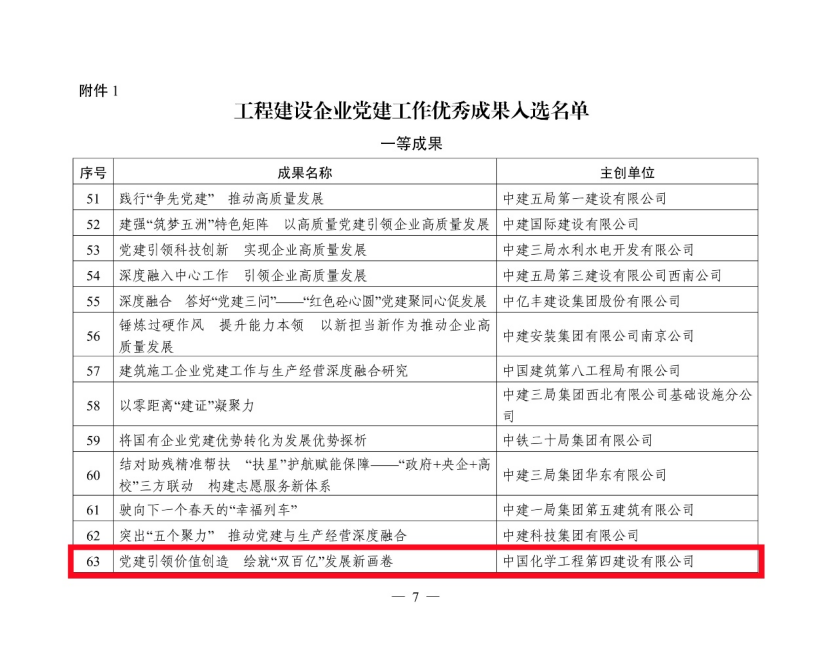 2023年以來,公司黨委先后榮獲“工程建設行業(yè)黨建工作示范單位”“中國石油和化學工業(yè)文化建設先進單位”等榮譽,公司黨委黨建品牌“黨旗領(lǐng)航·四化先鋒”榮獲中施企協(xié)2023年“工程建設企業(yè)黨建工作最佳案例”等稱號。下一步,公司將以此為契機,持續(xù)總結(jié)推廣企業(yè)黨的建設的先進經(jīng)驗,厚植高質(zhì)量黨建引領(lǐng)保障高質(zhì)量發(fā)展優(yōu)勢,為做強做優(yōu)做大國有資本提供堅強的政治保證和組織保證。