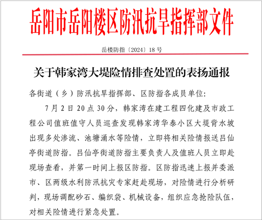 7月5日,岳陽市委常委、常務(wù)副市長李建華到項(xiàng)目現(xiàn)場督導(dǎo)防汛工作,對公司前段防汛工作給予充分肯定。同日,岳陽市岳陽樓區(qū)防汛抗旱指揮部發(fā)來通報(bào),對項(xiàng)目部精心組織、及時(shí)處置,確保管涌險(xiǎn)情得到有效控制予以表揚(yáng),并對喻希陽予以嘉獎。
