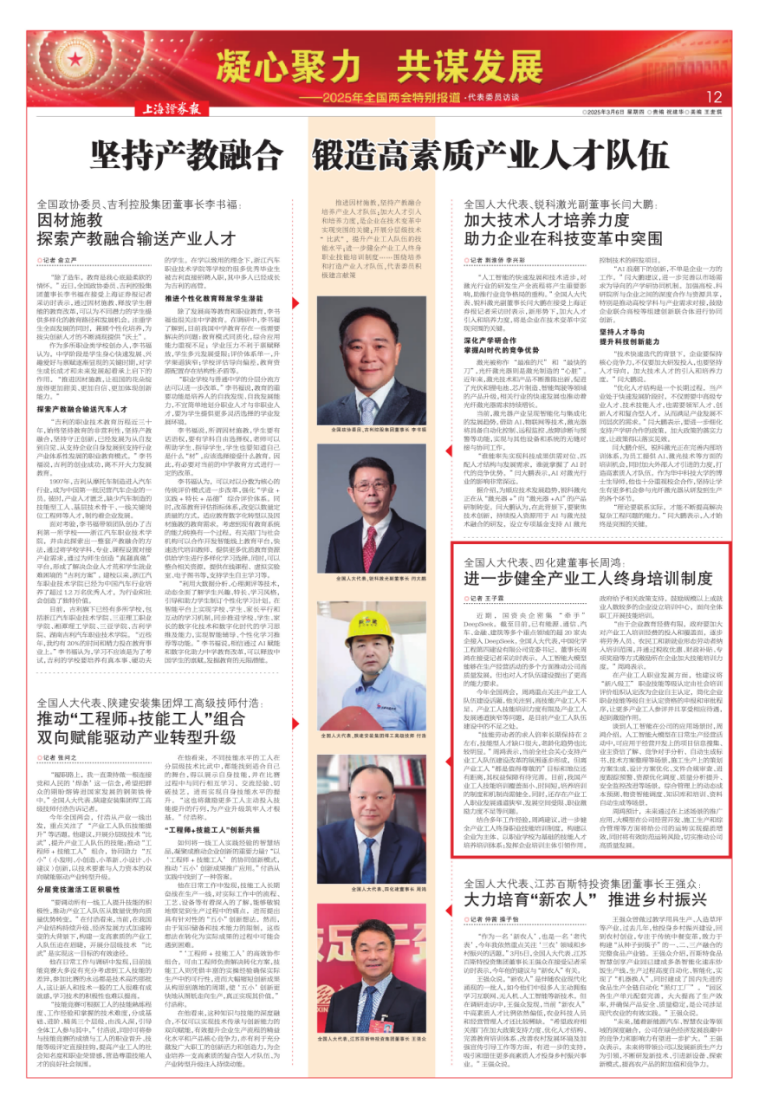 3月6日,證券時(shí)報(bào)客戶端以“堅(jiān)持產(chǎn)教融合 鍛造高素質(zhì)產(chǎn)業(yè)人才隊(duì)伍”為題報(bào)道周鴻的建議:進(jìn)一步健全產(chǎn)業(yè)工人終身培訓(xùn)制度。