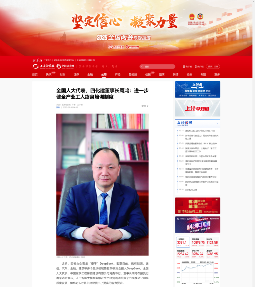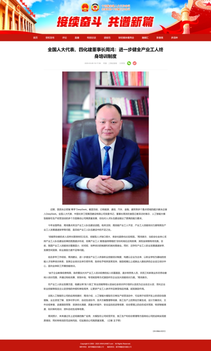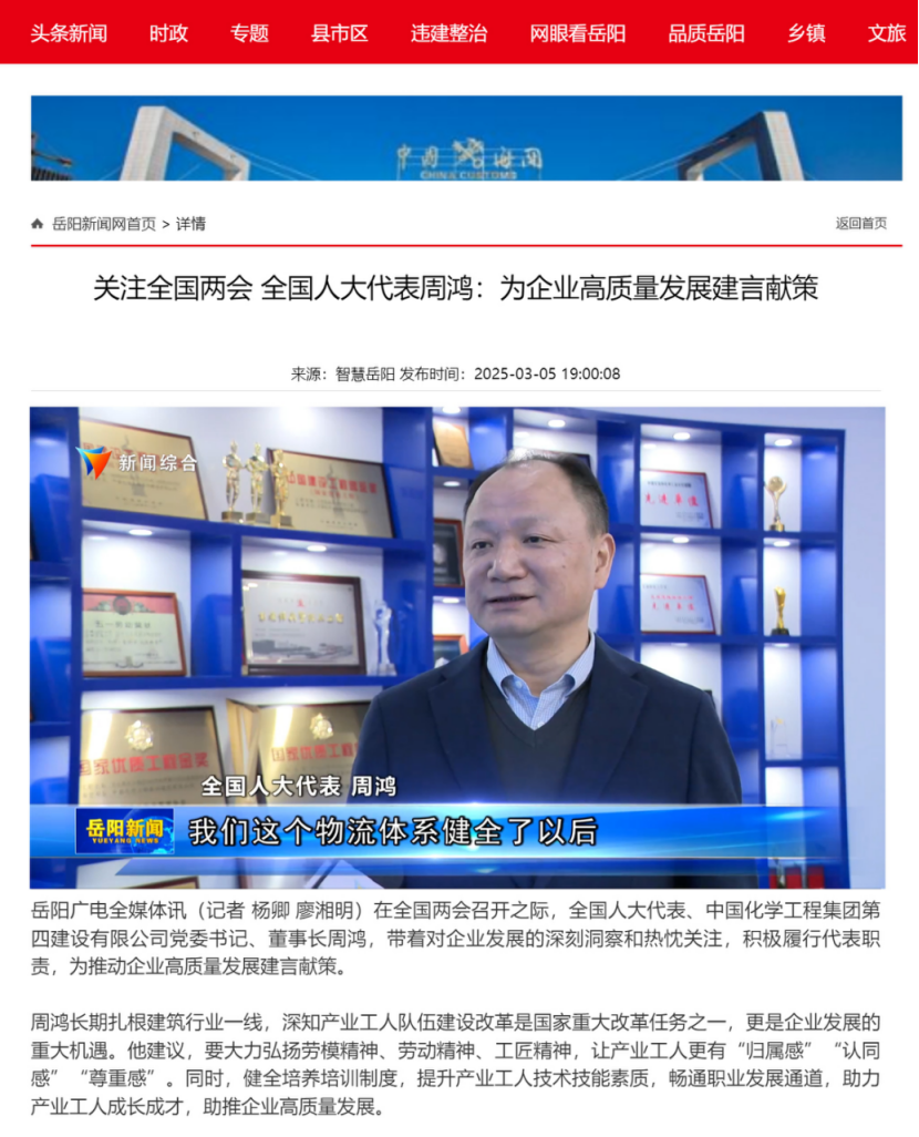 2025年全國(guó)兩會(huì)期間,全國(guó)人大代表,中國(guó)化學(xué)四化建黨委書(shū)記、董事長(zhǎng)周鴻向大會(huì)提交《關(guān)于加強(qiáng)產(chǎn)業(yè)工人隊(duì)伍建設(shè)的建議》《關(guān)于多措并舉解決拖欠建筑施工企業(yè)工程款的建議》《關(guān)于推動(dòng)洞庭湖區(qū)常岳九鐵路、荊岳鐵路、監(jiān)利至華容至益陽(yáng)鐵路規(guī)劃建設(shè)提速的建議》《關(guān)于修改最高法院〈關(guān)于大型企業(yè)與中小企業(yè)約定以第三方支付款項(xiàng)為付款前提條款效力問(wèn)題的批復(fù)〉的建議》等4條建議,受到主流媒體深入報(bào)道,引起社會(huì)各界廣泛關(guān)注。