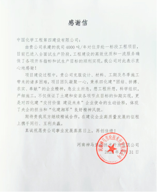 近日,由江西公司承建的4000噸/年對(duì)位芳綸一標(biāo)段工程項(xiàng)目全面進(jìn)入試生產(chǎn)階段。項(xiàng)目團(tuán)隊(duì)?wèi){借高效履約能力與卓越服務(wù),贏得業(yè)主單位河南神馬芳綸技術(shù)開發(fā)有限公司的高度認(rèn)可,并發(fā)來感謝信,肯定團(tuán)隊(duì)的專業(yè)實(shí)力與責(zé)任擔(dān)當(dāng)。