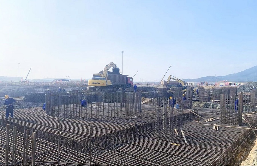該裝置項目共有7個單元,自8月15日開工以來,項目部克服工期時間緊、地質(zhì)巖石多、施工現(xiàn)場點多面廣、疫情防控難等諸多困難,全力搶抓進度。截至目前,初期雨水池池壁鋼筋已綁扎完成,氧化提濃單元核心設(shè)備基礎(chǔ)承臺澆筑完成,精餾單元各框架基礎(chǔ)陸續(xù)施工,異丙苯單元大面積開挖,裝置變電所基礎(chǔ)柱、梁混凝土澆筑完成。項目部將充分利用好當前晴好天氣,合理組織班組施工作業(yè),全力加快施工進度,確保完成各項既定任務(wù),為黨的二十大勝利召開獻禮。