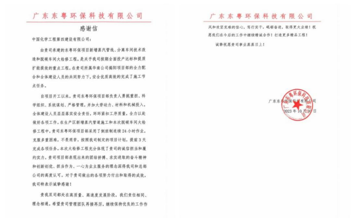 華南公司廣東東粵環(huán)保項(xiàng)目部收到業(yè)主感謝信